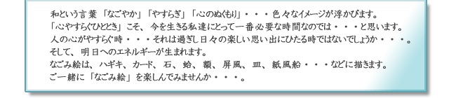和という言葉「なごやか」「やすらぎ」「心のぬくもり」・・色々なイメージが浮かびます。「心やすらぐひととき」こそ、今を生きる私達にとって一番必要な時間なのでは・・と思います。なごみ絵は、ハガキ、木炭、カード、石、蛤、額、屏風、皿、紙風船・・などに描きます。